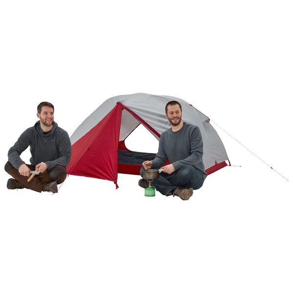 Das Kuppelzelt bietet echten Platz für 2 Personen mit Gepäck. Die beiden Eingangsbereiche sind groß geschnitten, ermöglichen das separate organisieren der Ausrüstung und einen bequemen Ein- und Ausstieg zur wetterabgewandten Seite. Auch die verbesserte Apsis bietet genug Platz für Rucksäcke oder andere Ausrüstung. Durch den zweiten Abspannpunkt läuft die Apsis nun nicht mehr spitz, sondern eckig zu, was zu einer größeren Apsisfläche bei gleicher Stellfläche sorgt. Die Stangenkonstruktion ermöglicht große Kopf- und Beinfreiheit und bietet im gesamten Innenzelt eine angenehme Sitzhöhe.